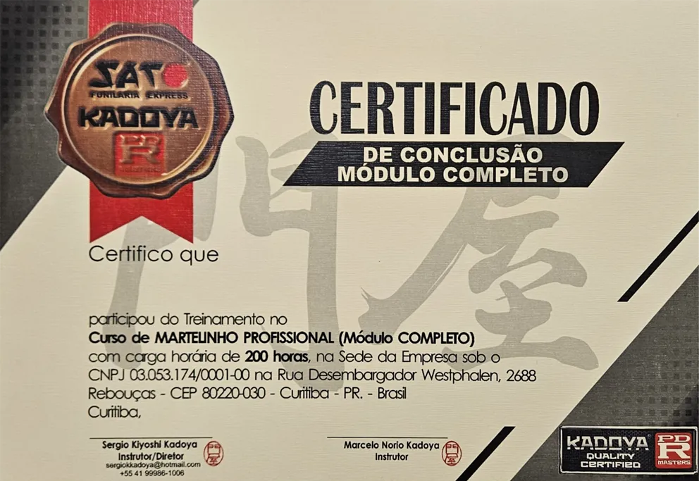 Quando concluir o curso, o professor Sergio o irá te avaliar, e se você estiver apto para ser um profissional qualificado, receberá o certificado renomado no mercado de Martelinho de Ouro.